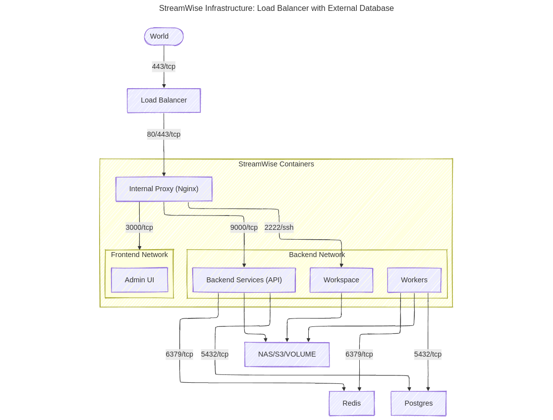 The following diagram shows an example of StreamWise Infrastructure with an external load balancer and external databases, this is a common setup for production environments.