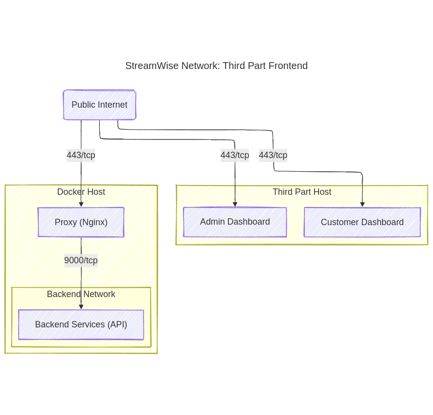 The following diagram shows a cropped example of StreamWise Infrastructure with all services running on the same Docker Host and a frontend server running on a third party provider.