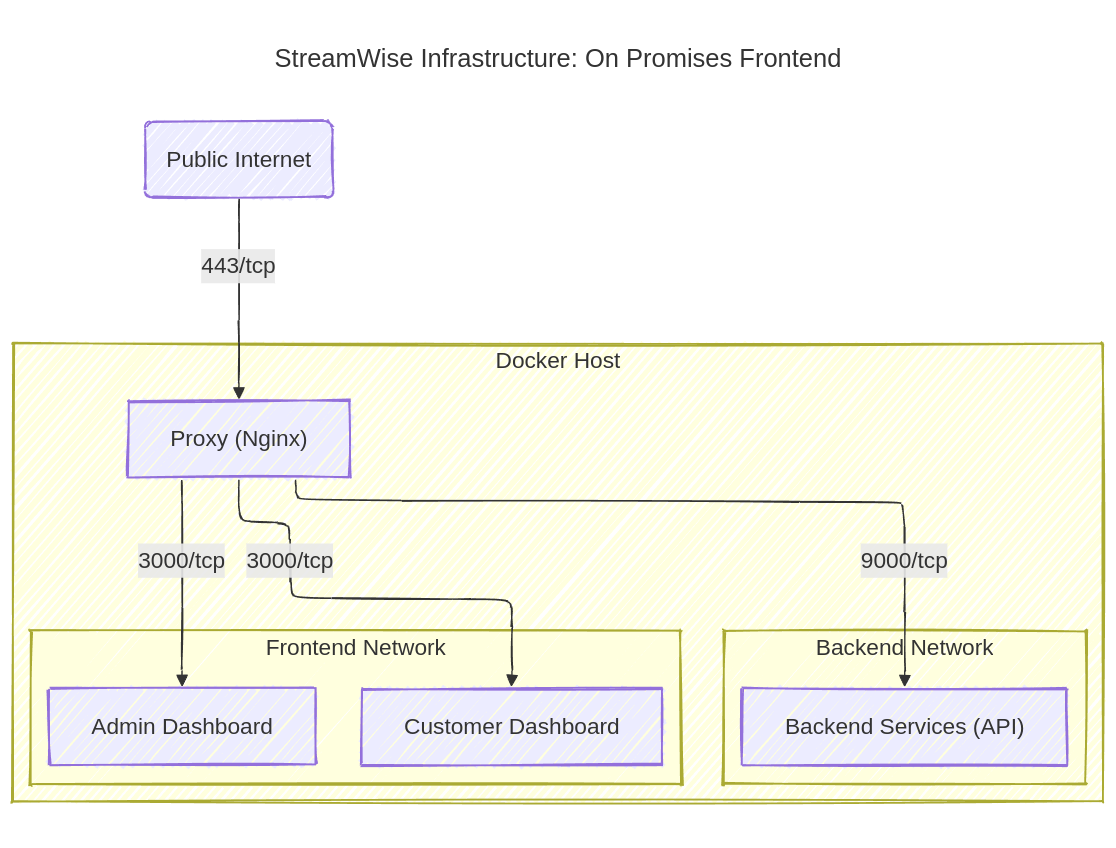 The following diagram shows a cropped example of StreamWise Infrastructure with all services running on the same Docker Host and a frontend server running on premises.