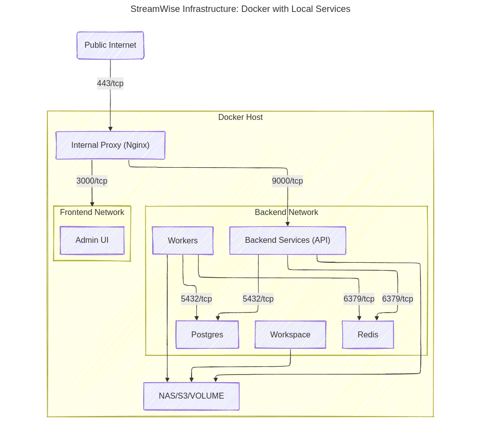 The following diagram shows an example of StreamWise Infrastructure with all services running on the same Docker Host. This is a common setup for small or budget environments.